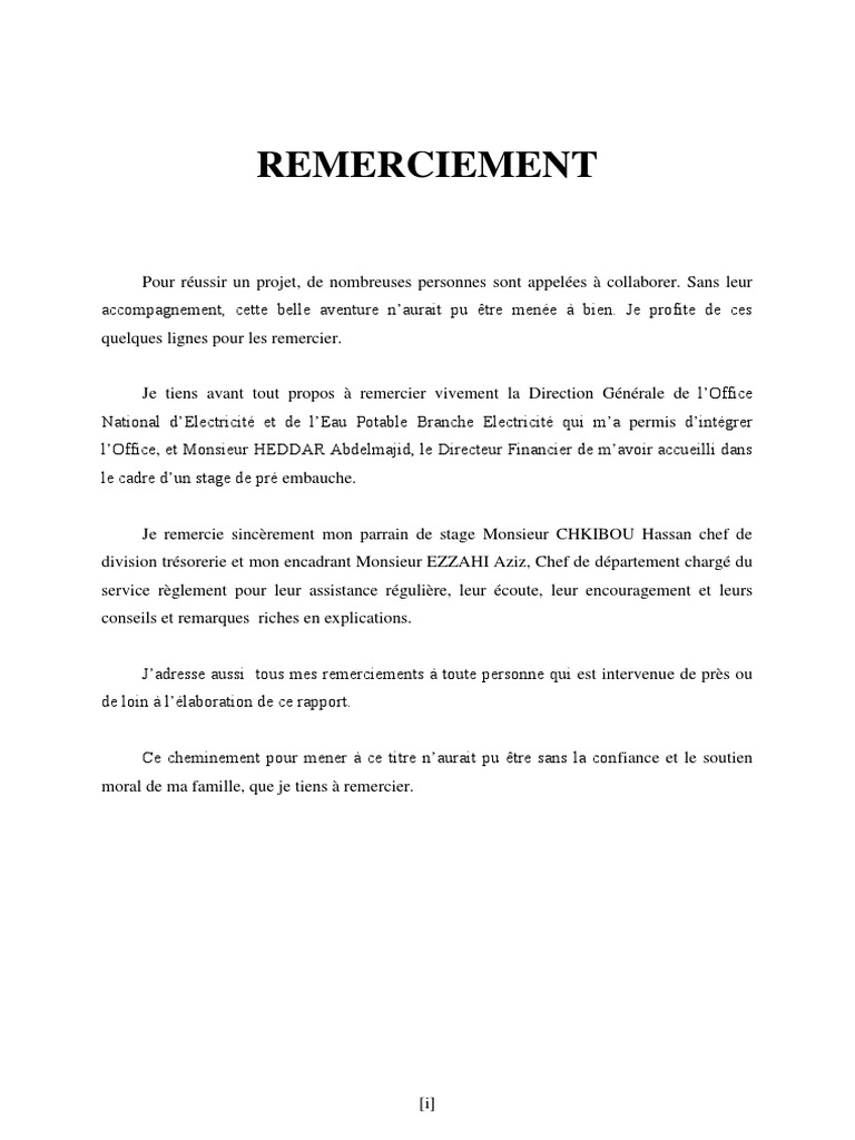 Je tiens tout d’abord à remercier très chaleureusement (–) pour son accueil, son aide, son attention et sa gentillesse tout au long du stage, qui ont fait de ces six mois un moment très plaisant et intéressant. Avant d’entamer ce rapport, nous profitons de l’occasion pour remercier tout d’abord notre professeurMonsieur Mohammed Rabi qui n’a pas cessé de nous encourager pendant la durée du projet, ainsi pour sa générosité en matière de formation et d’encadrement.